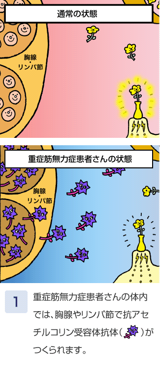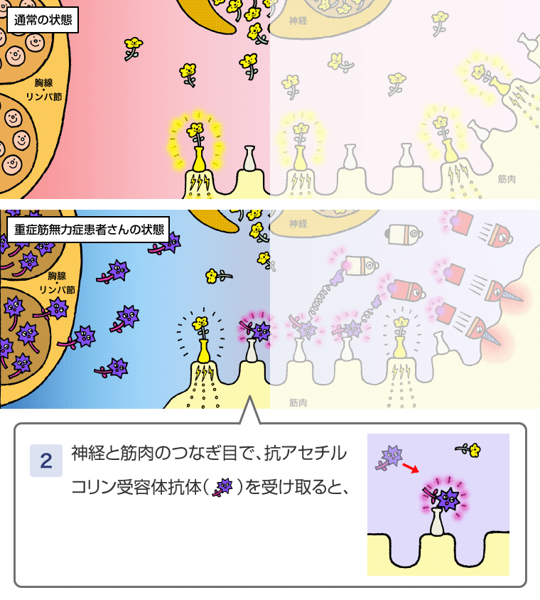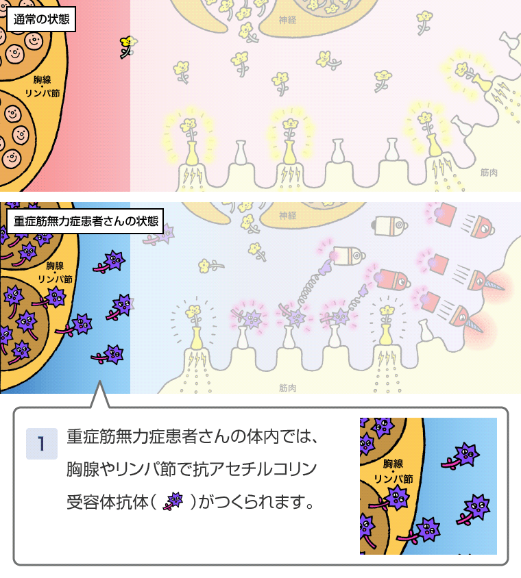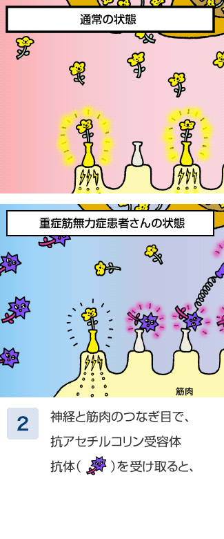 抗アセチルコリン受容体抗体陽性の重症筋無⼒症患者さんの体内でつくられる⾃⼰抗体。これを筋⾁が受け取ると、不具合が起こる。