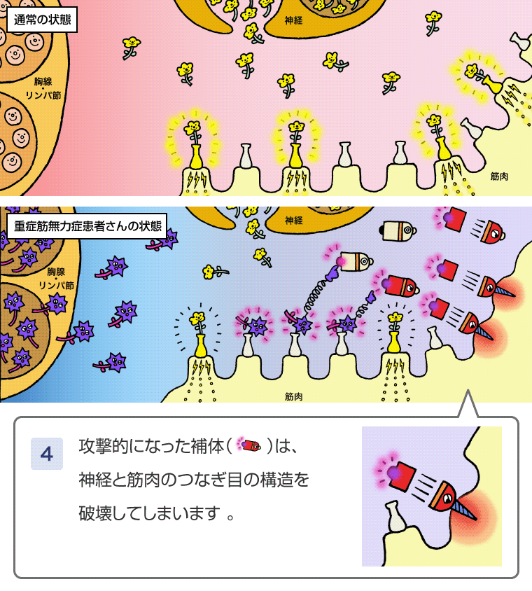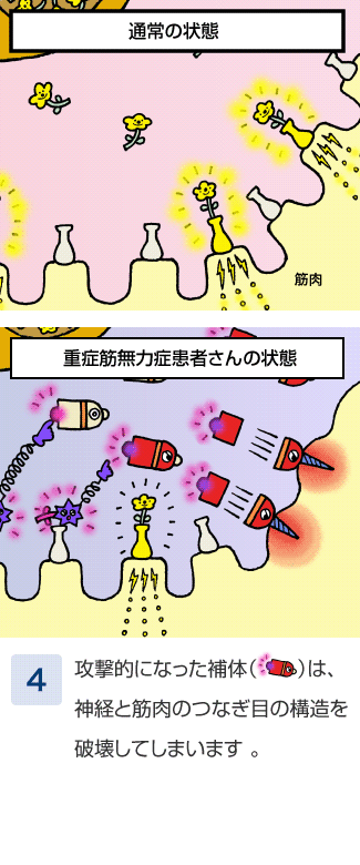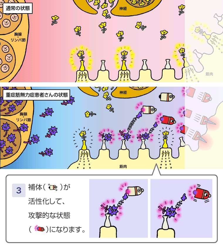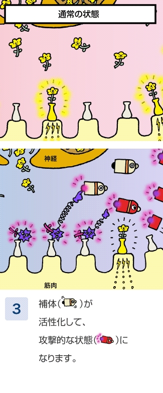 筋⾁が⾃⼰抗体を受け取ることで攻撃的な状態に変⾝した補体。