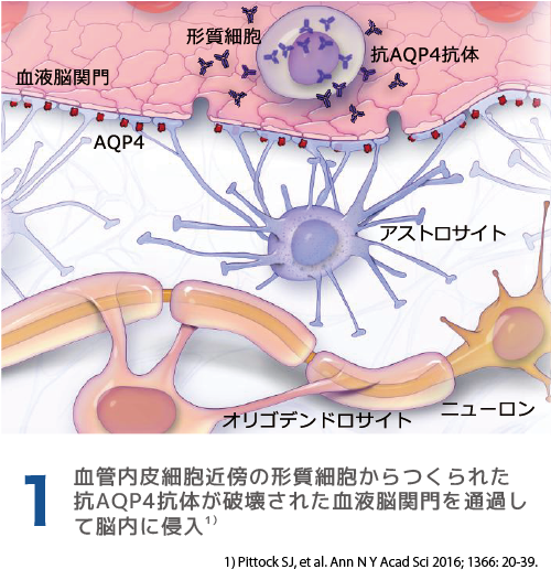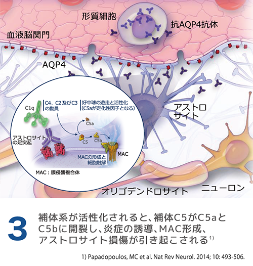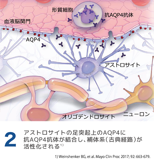 自己抗体である抗AQP4抗体がアストロサイトのAQP4と結合することで、免疫機構である補体が活性化され、それによりアストロサイトが破壊されます。アストロサイトの破壊に伴い2次的に脱髄・神経細胞死が起こり、様々な症状を引き起こします。