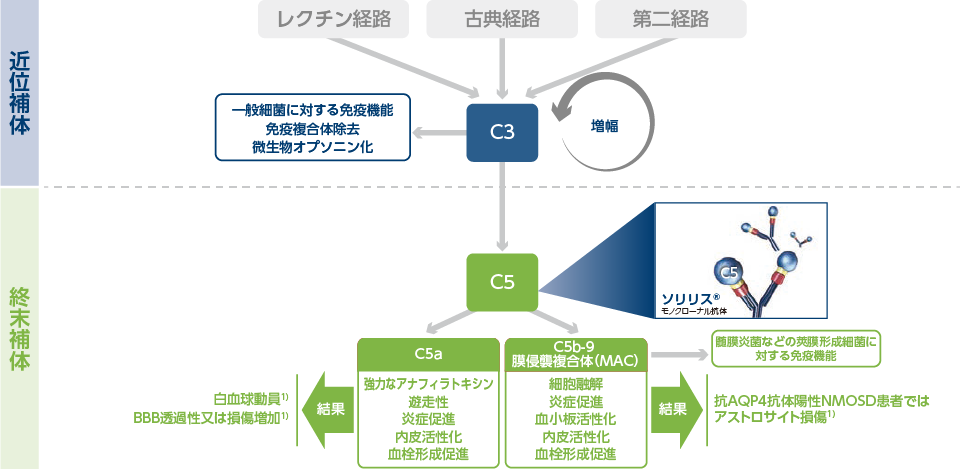 ソリリス®は補体C5の開裂を特異的に阻害し、終末補体複合体C5b-9の生成を抑制する抗補体モノクローナル抗体製剤で、わが国では2010年4月に「発作性夜間ヘモグロビン尿症における溶血抑制」の適応で承認されました。NMOSDに関しては、2019年11月に「視神経脊髄炎スペクトラム障害(視神経脊髄炎を含む)の再発予防」の追加適応が承認されています。
